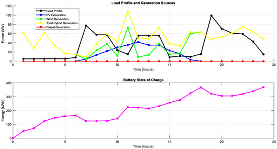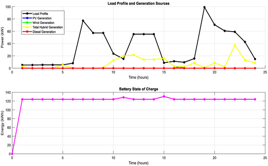 At 12 h: At this time, the load demand exceeds the power generated from the PV and wind facility. The state of charge of the battery remains at 124 kWh, showing that the battery is discharging to meet the load.