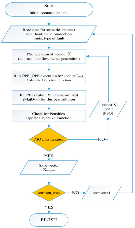 For each operational scenario, a PSO algorithm determines a decision vector X comprising the power flows of the DC interconnections and the wind power generation of each interconnected power systems. Given the decision vector X known, then OPF is applied to each of the interconnected power system. This involves calculating the production levels of each generator that minimize the operation cost of the power system, complying at the same time with all technical and operation constraints. Subsequently, transient stability tests are conducted, with a penalty function (Pen) triggered, and thus the solution is rejected if system instability is detected. Therefore, the final PSO optimal solution will include an assessment of the transient stability in the interconnected power systems. Dynamic models of power system components have been developed and modified for the purpose of these tests, which involve significant and critical disturbances such as three-phase short circuits, DC line openings, as well as power unit trips.