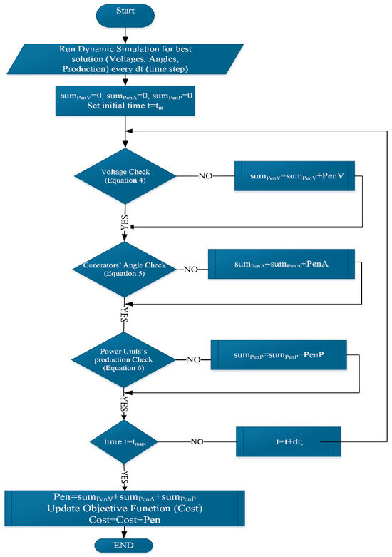 The developed algorithm utilizes bus voltages, generator angles, and speeds to determine the transient stability of the power system. A period t = tmax − tin, with a step time dt is used for the short-term transient stability test. When a significant voltage instability occurs, the corresponding penalty is applied, as depicted in Figure 3. Various voltage stability indices (VSIs) have been introduced in the literature. In [28], VSIs were reviewed by considering different aspects and viewpoints of the problem, revealing that VSIs should be based on concepts such as maximum power transferred through a line, existence of solutions for voltage equations, the Jacobian matrix, P–V curve, Lyapunov stability theory, and the maximum power transfer theorem. In [29], a systematic power system transient stability performance quantification method is proposed, which utilizes the existing North America Reliability Corporation assessment criteria. This method investigates cases of system separation, loss of sources, damping, and voltage sag during transient stability situations.