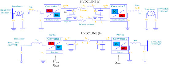 HVDC system topology, converters, and DC line: (a) full model; (b) simplified model.