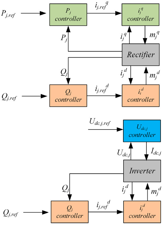 For each HVDC transmission system, two power converters and a DC line are utilized. Each converter is linked to an AC grid through a filter and a transformer. The DC line has been modeled using its Π-equivalent. A 2-pole DC transmission line is considered in the adopted scheme. For submarine interconnections, the use of the sea as an active part of the ground return, based on shoreline pond electrodes, has been proposed for cost limitation reasons. Refs. [30,31] present analytical models for the electric field, in shoreline pond electrode design, for a recent project, 1 GW, ±500 kV HVDC interconnection between Crete and mainland Greece. The work in [32] presents a techno-economic optimization analysis of an autonomous photovoltaic power system for the shoreline electrode substation of the above HVDC link. Figure 5 shows the block diagrams of the control systems of the power converters. More detailed analysis of the converter models can be found in [33,34]. The VSC uses a two-level pulse width modulation (PWM), where the modulation factor is the control variable. The relation between the AC and DC voltage is given as , where represents the modulation factor of the converter. Where , as it is assumed that the converter operates in rectangular modulation. The inverter controls the active power, while the rectifier of the HVDC system controls the DC voltage [35]. The reactive power can be controlled independently in each converter by the output AC voltage.