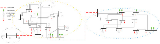 A properly modified network based on the IEEE 24-bus case was modeled to test the proposed method. The IEEE 24 bus system consists of two different areas with two high voltage levels. These two areas are supposed to be connected through power transformers and AC lines. However, in this study, no AC interconnection is included. Instead, an HVDC connection between the two subsystems is used. By disconnecting these two subsystems, they become weaker compared to when they operate connected. Additionally, another system has been added, consisting of buses 25 and 26 in Figure 8. This 2-bus system acts as an infinite bus, representing a big and stable grid (main grid). The first HVDC line connects bus-25 to bus-15 and the second one connects bus-3 to bus-24, as shown in Figure 8. Furthermore, five wind parks have been connected to each of the two power systems.