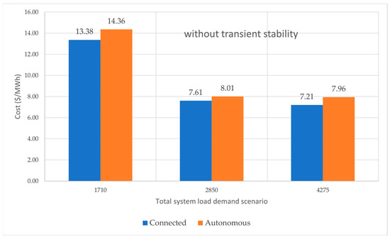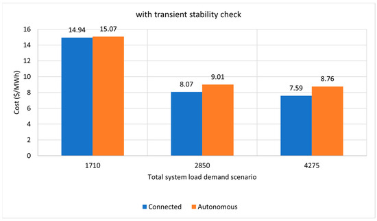 In Figure 9, a comparison of the total fuel cost of energy produced between the interconnected and autonomous operation of the system for simulations without dynamic stability tests is given. Figure 10 presents a comparison of the total fuel cost of energy produced between the interconnected and autonomous operation of the system, including dynamic stability tests (short circuit fault at bus no. 1). The choice of bus no. 1 for the fault is indicative. Similar results are obtained for other bus-fault cases. In the test case of this paper, there was an average increase in cost of approximately 8%.