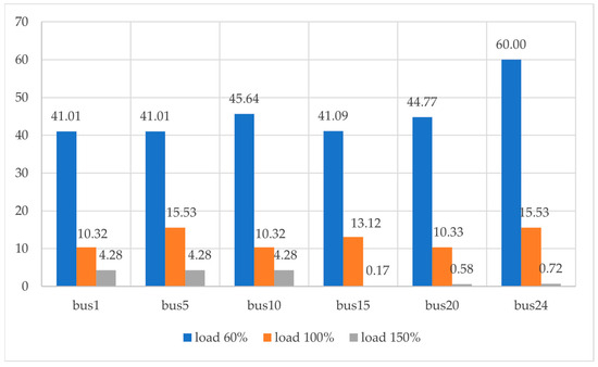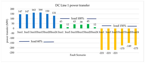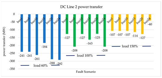 To meet the requirements for the angles, speeds, and voltages during a significant fault, the conducted, indicated the limitations that should be imposed in certain cases. Figure 12 and Figure 13 show the results of tests for short circuit faults at buses no. 1, no. 5, no. 10, no. 15, no. 20, and no. 24 of the system under investigation, under three different loading scenarios. Table 4 presents the power transfer through the DC lines for the same loading scenarios, without fault events. In some fault cases (e.g., load 100%, fault at bus 5 and bus 24), the power transfer through DC lines is better than neglecting the transient stability study. This can be explained as, for stability reasons, a limitation in wind generation will make it necessary for the power flow on the DC lines to change in order to satisfy the load demand and OPF criteria.