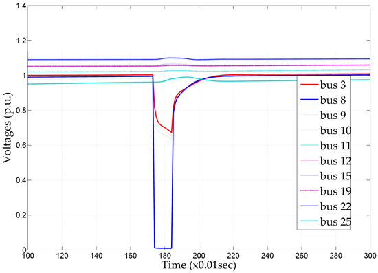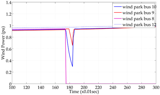 The MatDyn software was appropriately modified by incorporating HVDC lines and converter models, as well as variable speed wind generators. Figure 14, Figure 15, Figure 16, Figure 17, Figure 18 and Figure 19 demonstrate power system magnitudes during transient stability simulations, for a test case in which a solid and balanced three-phase short circuit occurs at bus 8 at time t = 1.7 s and is cleared at time t = 1.8 s. The developed algorithm verifies magnitudes beyond certain limits and imposes penalties, as previously mentioned.