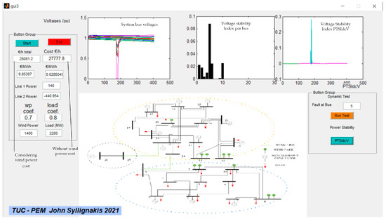A MATLAB POWER GUI application was created for the test case system, utilizing a specific part of the proposed method as shown in Figure 20. The user of the application enters the scenarios of system loading and wind power generation. The application utilizes the PSO algorithm to compute DC line power transactions and total system optimum cost. Additionally, the user can perform a transient stability test for three-phase short circuits at a selected bus of the network. The application displays the voltages of system buses, along with the value of the voltage stability index introduced in this paper in (7) and (8).