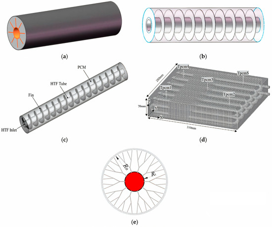 Various heat exchange surfaces to intensify heat exchange in a heat accumulator with PCMs. (a) Rectangular fins; (b) annular fins; (c) spiral fins; (d) plate fins; (e) dendritic fins [56].