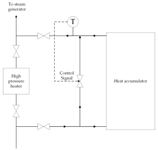 Several works describe solutions for introducing heat accumulators into nuclear power plant circuits to increase the maneuverability of nuclear power plants [29,30,31]. Heat accumulators can be used to store excess reactor heat during hours of minimum electricity demand and return the stored heat to the steam turbine cycle to generate additional electricity during peak hours [32,33,34]. The most preferred option is to use heat accumulators to replace high-pressure heaters (HPHs) [29,35].