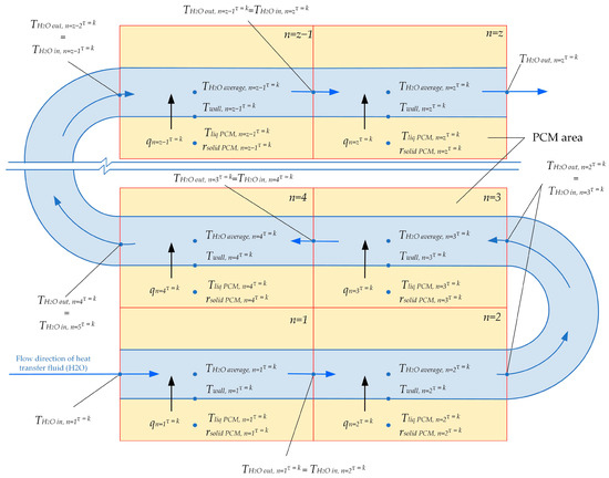 Thus, it is assumed that the heat transfer between the heat transfer fluid and the PCM at each moment in each discrete section is uniquely determined by the wall temperature, the thickness of the solid layer of the PCM, and the temperature of the liquid PCM. It is also assumed that the change in the solid layer of the PCM and the temperature of the liquid PCM at each moment for each discrete section are uniquely determined by the heat flux density, wall temperature, thickness of the solid layer of the PCM, and the temperature of the liquid PCM.