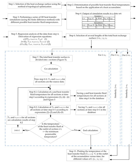 By analogy with previous work [98], the described calculation method makes the following assumption: certain sections of the heat exchange tube up to 1 m long and the area of the PCM around tubes are considered separately, without considering the influence of adjacent sections. A flowchart of the method is shown in Figure 6.