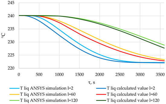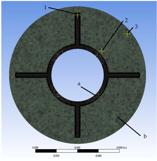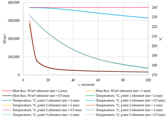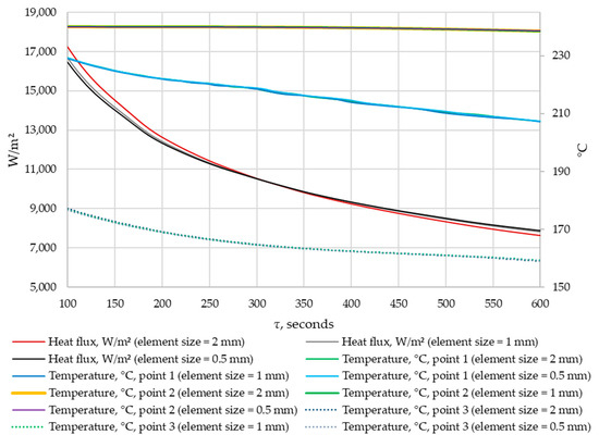 In the grid-independence study, the sizes of the grid elements were compared to 2, 1, and 0.5 mm. The results of the comparison are presented in Section 3.1. Based on the results, it was concluded that the independence of the solution was achieved with a grid element size of 1 mm. With a further decrease in the grid element size, the difference in heat transfer intensity at the corresponding time points did not exceed 2%. There were no significant temperature changes at the control points (see Figure 7) at the corresponding time points.