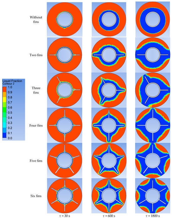 Longitudinal fins seem to be the most promising solution for enhancing heat transfer in the current study. These fins increase the overall rigidity of the structure, which is a positive feature for large-scale accumulators with PCMs [77]. Many researchers reported on the effectiveness of dendritic longitudinal fins [71,83,88] (Figure 1e). However, the use of dendritic fins is associated with an increase in the number of individual structural elements and connecting joints [89]. This complicates and increases the cost of construction, as well as increasing the risk of violation of the mechanical strength of the structure. Reliability issues are a topic of concern in equipment in the nuclear industry, so this paper considers intensification through simple longitudinal fins. This solution is effective, reliable, and easy to implement [90]. It is possible to create such a design by welding standard round pipes and standard metal strips together.