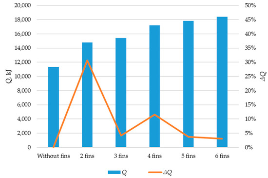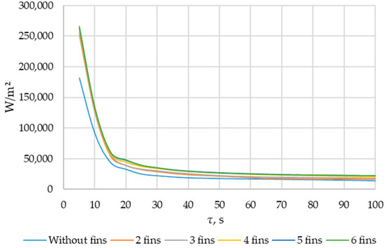 As mentioned in the introduction, to intensify the heat exchange, a heat exchange surface with longitudinal fins was adopted. We conducted a topological optimization to determine the optimal number of fins. To do this, we modeled the heat transfer process using heat exchange surfaces with different numbers of longitudinal fins: 2, 3, 4, 5, and 6. The optimization criteria are the total amount of energy transferred within 30 min and the dynamics of the heat flux density over 30 min. The heat transfer modeling was performed using the ANSYS FLUENT (Student version 2021 R2). The simulation process is described in Section 2.4 in more detail.