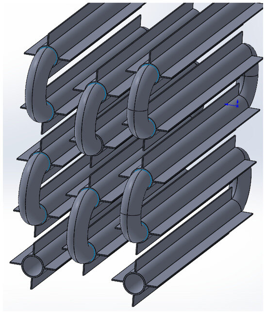 In the previous work [98], we considered the method of using a heat accumulator with a PCM in low-power nuclear power plants. The schematic diagram of a low-power nuclear power plant with a heat accumulator with a PCM is shown in Figure 2. The heat exchange surface of the accumulator is a coil (Figure 3). The area between the tubes is filled with a PCM. In [98], solar salt was chosen as the PCM using the weighted sum method. The thermophysical properties of the solar salt are presented in Table 1.