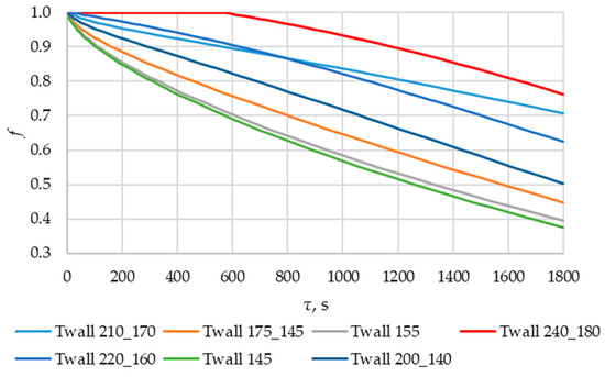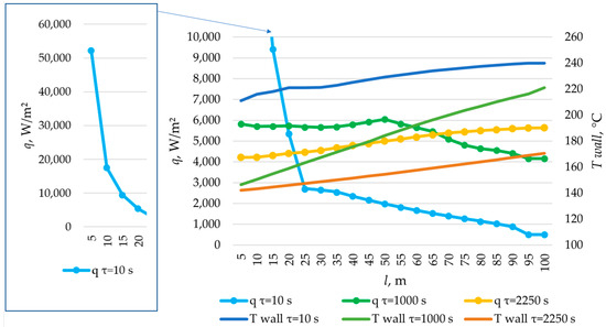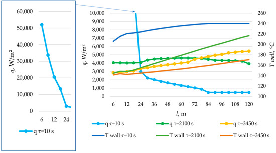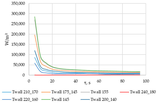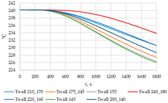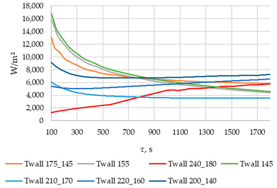 The simulations with wall temperatures Twall = 145 and 155 °C characterize the heat transfer dynamics in the initial sections of the heat exchange surface. The simulations, with a gradual decrease in wall temperature from 200 to 140 °C and from 175 to 145 °C, characterize the dynamics of heat exchange in the central region of the heat exchange surface. The simulations with gradual decreases in wall temperature from 240 to 180 °C, from 220 to 160 °C, and from 210 to 170 °C characterize the dynamics of heat exchange in the final region of the heat exchange surface. The results of the simulations are presented in Section 3.4.