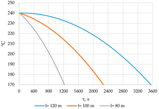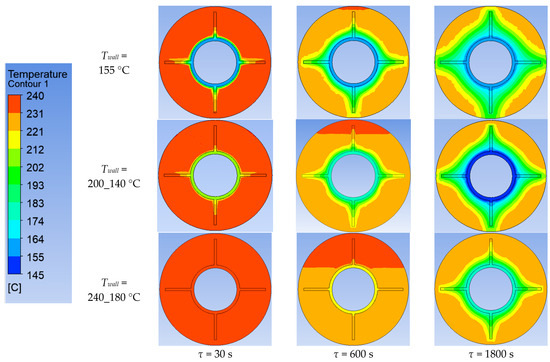 The outer boundary of the simulated area is an adiabatic wall. The first-kind boundary condition, which is the law of change in temperature with time, is set at the inner boundary. The initial temperature in the simulated area is 240 °C.
