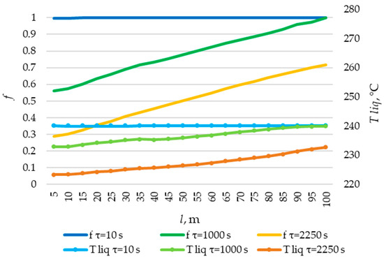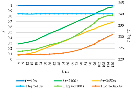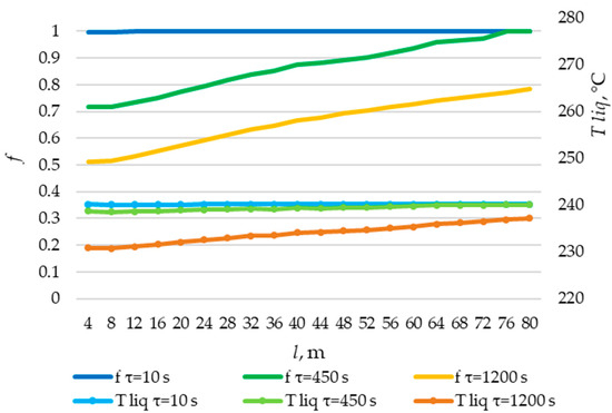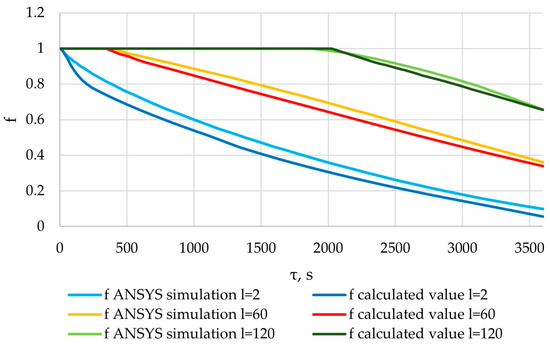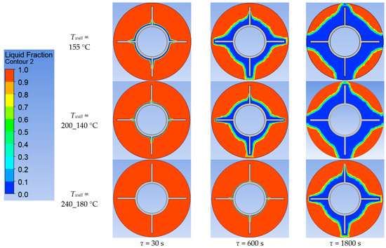 The controlled (variable) parameter in the simulation is the temperature on the inner surface of the heat exchange tube (Twall). The measured (output) parameters are the heat flux density (q) at the inner boundary of the heat exchange tube, the average temperature in the liquid phase region of the PCM (Tliq), and the proportion of the liquid phase of the PCM (f) within the volume of the PCM. The controlled simulation parameters are set according to the data provided in Table 2.