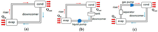 A loop heat pipe (LHP) is an advanced two-phase heat transfer device that efficiently transports thermal energy over long distances, typically up to several meters. As a highly efficient cooling solution for cooling data centers, it has been a hot topic in recent years [3]. The driving force for an LHP can be gravity, as shown in Figure 1a, but some problems may exist, such as a slow start-up, a necessary height difference between the evaporator and the condenser, and poor system performance when handling a high heat flux, large room, long pipelines and multiple branches [1]. To increase the driving force, either a liquid pump or a gas pump may be employed, as shown in Figure 1b,c. These are also called mechanically driven two-phase cooling loops.