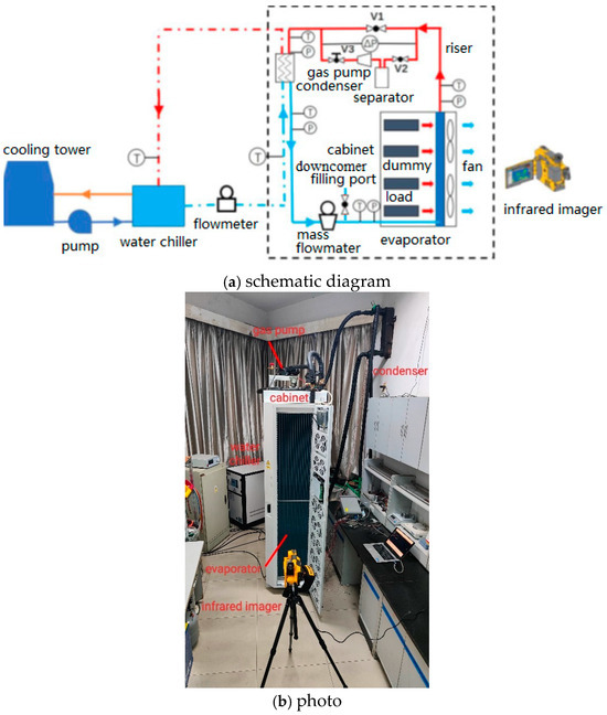The schematic diagram and a photo of the experimental system are shown in Figure 2; the system was transformed from the setup utilized in a previous study [19]. The orientation of the evaporator and condenser in the setup is identical to that at the engineering site. The part enclosed by the rectangular dashed line is the loop heat pipe. R134a is chosen as the working fluid due to its widespread use and its zero ozone depletion potential [2]. However, because of its moderate Global Warming Potential (GWP), there is a growing shift towards phasing out R134a in favor of more eco-friendly alternatives. R134a is charged into the LHP as follows: (1) the LHP is vacuumed to below 100Pa for over half an hour; (2) R134a in a storage tank is filled into the LHP through the filling port; and (3) the charged amount is determined by the weight difference in the tank before and after the charge. The cooling water of the LHP is provided by a water-cooled chiller. The experimental system can run in two modes: using a gravity-assisted LHP and GPLHP; these are switched by the open/close of three valves, V1, V2 and V3. An oil-free linear compressor (Embraco, WMD7H) is used as the gas pump. Its operation can be regulated with a specific inverter that outputs a voltage of 110–135Hz. The pressure lift afforded by the gas pump is partially offset by the V3 valve according to the test requirements. The evaporator of the LHP is a finned-tube heat exchanger that has four rows of tubes. Fourteen inverter fans blow air through the evaporator. The condenser of the SHP is a plate heat exchanger. The bottom of the condenser is 0.6m higher than the top of the evaporator. Detailed information about the evaporator and the condenser is given in Table 1. The riser has a length of 6 m and an inner diameter of 17 mm. The downcomer has a length of 6.7 m and an inner diameter of 14 mm. Four electric heaters that have a total of 8 kW of heating power are placed evenly in the cabinet to serve as the dummy load.
