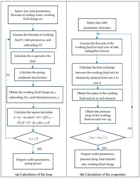 Assuming that the configuration of the GPLHP (including the structure of the evaporator and the condenser, the length and diameter of the riser and downcomer, the type of gas pump, and the height difference between the evaporator and the condenser), the inlet air parameters of the evaporator, the inlet water parameters of the condenser and the filling ratio of the working fluid are known, the performance curve of the GPLHP may be predicted by solving the aforementioned equations, which describe mass, energy and momentum conservations, and heat transfer and fluid flow characteristics. The evaporator is segmented in the same way as our previous study [19]. The solving procedure shown in Figure 3a is described briefly as follows: (1) input the known parameters, including the size of each component of the GPLHP, the inlet parameters, the flowrate of the cooling water, the flowrate of the working fluid and the working fluid charge; (2) assume the thermodynamic state of the working fluid at the evaporator inlet and the flowrate of the working fluid; (3) calculate the heat transfer and the fluid flow in the evaporator row by row and adjust the flow distribution of the working fluid between rows to ensure pressure drop balance, as shown in Figure 3b; (4) calculate the flow process in the riser; (5) calculate the thermodynamic process in the gas pump; (6) calculate the heat transfer and fluid flow processes in the condenser and the downcomer; (7) compare the calculated working fluid charge and the assumed charge, the calculated and assumed inlet state parameters of the evaporator, and adjust the flowrate of the working fluid, the inlet pressure and the subcooling of the evaporator; (8) repeat (2)~(7) until convergence () is reached; and (9) output the results, including the outlet parameters on both sides of the evaporator and the condenser, the heat transfer rate, the pressure drop on the air side, and the fan power and pump power.