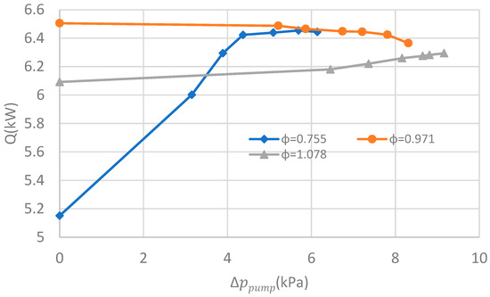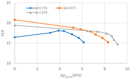 As depicted in Figure 4, when the pressure lift afforded by the gas pump increases, the mass flowrate of the working fluid increases to varying degrees for three filling ratio scenarios. For the same pressure lift, the increment in the mass flowrate for is the largest, while the increment in the mass flowrate for is the smallest. The increase in the mass flowrate does not mean the improvement of heat transfer. As shown in Figure 5, for the scenario of insufficient charge, the heat transfer rate increases from 5.151 kW to 6.423 kW when the pressure lift rises from 0 to 4.37 kPa, but remains relatively constant with the further elevation of the pressure lift; for the scenario of overcharge, a minor positive effect of pressure lift is observed; a pressure lift of 9.16 kPa only results in a 3.3% change in the heat transfer rate. For the scenario of appropriate charge, an adverse effect of pressure lift is observed; a pressure lift of 8.31 kPa leads to a 2.2% reduction in the heat transfer rate. The thermal conductance of the LHP for the three filling ratio scenarios has a similar trend to that of the heat transfer rate, as shown in Figure 6. It is not surprising that the EER of the LHP decreases when a gas pump is employed in the scenarios of appropriate charge and overcharge. For the scenario of appropriate charge, the EER decreases from 20.8 to 15.2 as the pressure lift increases from 0 to 8.31 kPa. For the scenario of overcharge, the EER decreases from 19.5 to 14.8 as the pressure lift increases from 0 to 9.16 kPa. For the scenario of insufficient charge, as the pressure lift increases from 0 to 6.14 kPa, the EER initially increases and then decreases, reaching a maximum of 18.11 at a pressure lift of 3.89 kPa.