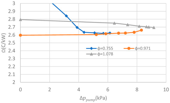 Figure 4, Figure 5, Figure 6 and Figure 7 illustrate the influence of pressure lift on the mass flowrate of the working fluid, the heat transfer rate, the heat conductance and the EER of the LHP under three filling ratio scenarios: 0.755, 0.971, 1.078, representing insufficient charge, appropriate charge and overcharge, respectively. The selection of these three filling ratios was based on our previous study [19]. Zero pressure lift corresponds to the gravity-assisted situation. The experiments were carried out under the following conditions: the inlet cooling water temperature of the condenser was fixed at 16, the simulated load was fixed at 8 kW, and the fan speed was fixed at 3500 rpm. The pressure lift was varied by regulating the input frequency of the gas pump, from 108 Hz to 118 Hz.