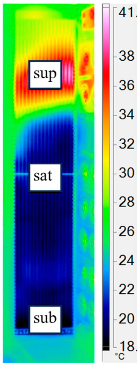 Infrared thermography is employed to monitor the operation of the evaporator in this study. As infrared thermal imagers become cheaper and better, this equipment is increasingly found in investigations on heat exchangers, from the measurement of the heat transfer coefficient to the fluid flow distribution [35,36,37]. However, there have been few studies on the monitoring of LHPs. Zhang et al. captured thermal images of the evaporator of a co2 LHP and observed that the superheated region diminishes and eventually vanishes as the filling ratio increases [38]. In this study, a quantitative analysis of thermal images was attempted based on the existing literature and the author’s experience [33,39]. The finding of an approximately linear relationship between the heat conductance of the LHP and the area ratio of the two-phase zone can aid in the debugging of the LHP. Based on a few field-measured points of paired heat conductance and area ratio, a relationship like Equation (29) can be established, allowing for the inference of the maximum heat conductance of the LHP. Therefore, infrared thermography has been demonstrated to be a powerful tool for debugging the operational performance of the LHP.