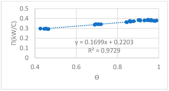 Figure 8 displays an image of the evaporator recorded by an infrared thermal imager, with the superheat zone, two-phase zone and subcooled zone labelled. The area ratio of the two-phase zone has been estimated using the method outlined in reference [33]. Through an analysis of the experimental datapoints obtained under different filling ratios and inlet cooling water temperatures, it was found that an approximately linear relationship exists between the heat conductance of the LHP and the area ratio of the two-phase zone, as shown in Figure 9. The relationship is expressed as follows: