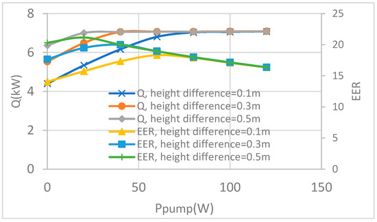 The effects of pressure lift on the Q and EER for different height differences between the condenser and the evaporator.