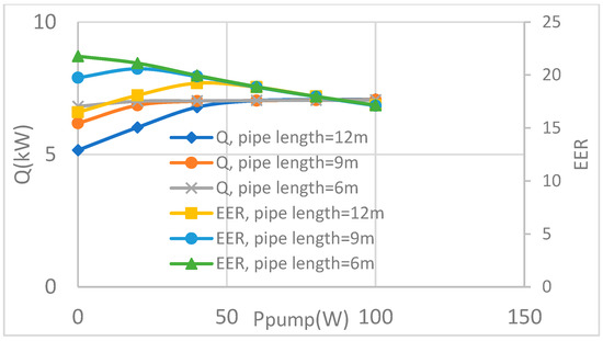 The effects of pressure lift on the Q and EER for different pipe lengths.