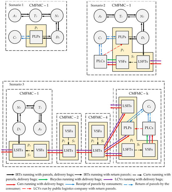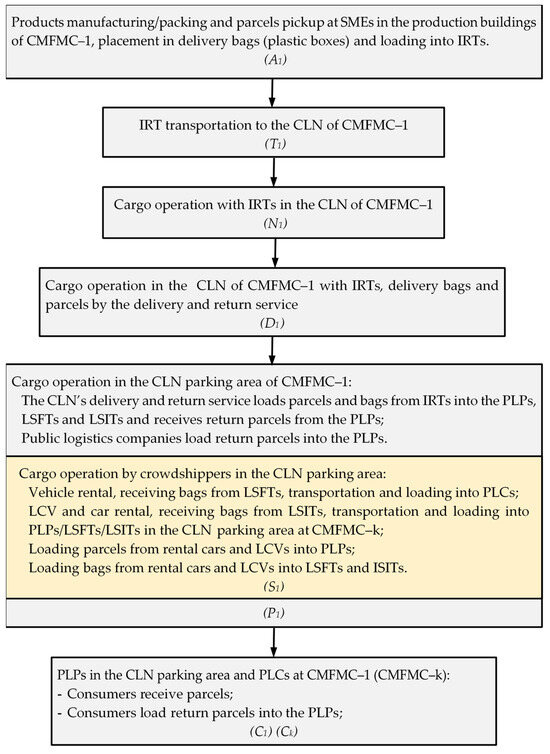 The CMFMC product flow in the form of parcels in IRTs passes through its CLN, dividing cargo flows into intra- and inter-clusters. Cargo in the IRTs is presented either in parcels or in delivery bags with parcels, and requires extensive sorting into delivery directions both within the CMFMC and outside it. Scenarios for parcel delivery in IRTs after sorting include loading into light e-trucks and courier delivery to the PLCs (less often, directly to consumers) or delivery to other CLNs of CMFMCs in the form of CCs. After CCs with parcels arrive at other CLNS, the scenarios of intra-cluster courier distribution of parcels to PLCs are repeated. Evidently, such scenarios for LMPD under the uncertainty of their generation in CMFMCs are not always acceptable and may lead to CLNs becoming overloaded. The uneven workload of CLNs at different times of the year requires a temporary increase in personnel and the allocation of additional space for organizing loading–unloading and sorting operations. In this regard, it is appropriate to consider sustainable scenarios for LMPD using crowdshippers and VSFs, as well as to evaluate delivery performance. This should account for the finite production capacity of parcel generation in CMFMCs during different periods of the year and for the composition and size of the VSFs, all of which will make this logistics process more sustainable and smart.