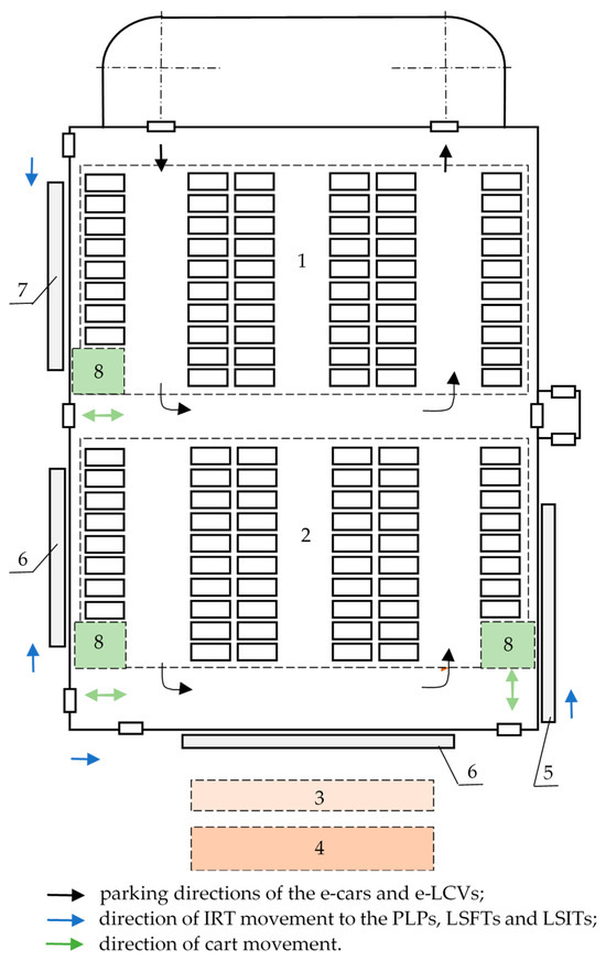 Figure 3 shows a ground floor plan of the multi-story parking area of the CLN with surrounding area to accommodate the VSFs. The possibility of stationary parking for LMPD fleets increases the sustainability, safety, and performance of urban freight transportation within the framework of the urban consolidation center concept [18,55].
