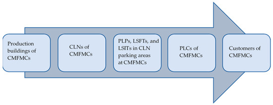 Finished products at the CMFMS enterprises are packaged in the form of parcels with a QR code that contains information about the cargo being transported, indicating the final delivery point and allowing stakeholders to track the delivery of parcels in real time. Parcels are sorted by the final delivery point using a QR code and packed into delivery bags (plastic boxes). The delivery bags are placed in the IRT, and information about the transported products is automatically entered into its reader device using IoT-Blockchain technologies. The average capacity of the IRT is four delivery bags with parcels. The loaded IRT enters the transfer area of the ground floor by means of the freight elevator of the production building, where, together with other IRTs, the city container (CC) is formed. The CC usually consists of six IRTs with compatible freights, which, after loading into a light e-truck, is delivered to the CLN of the CMFMC [1,4]. In the CLN, the new CCs are formed from the received IRTs according to their final CLN delivery and then transported there via light e-trucks. The IRTs also deliver parcels and bags to the parcel lockers and luggage storage facilities at the CLN parking area. The parcel lockers and luggage storage facilities at the CLN parking area are located in the adjacent area (within 10 m) and are divided into three groups. The first group is represented by the parcel lockers at the CLN parking area (PLPs) for final points of LMPD; the second and third group are represented by the luggage storage facilities for the final (LSFTs) and intermediate (LSITs) trans-shipment points of delivery bags. From the LSFTs, delivery bags are transported by crowdshippers to the PLCs within the same CMFMC, while, from the LSITs, bags are delivered to the PLPs, LSFTs, and LSITs of other CLNs in the CMFMCs.