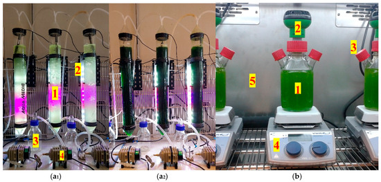 The test stands used in stages 1 and 2 (a) and stage 3 (b). (a) Microalgae biomass proliferation (S1) and separation (S2) (1—vertical tyubular photobioreactor (VT-PBR), 2—light source, 3—intermediate air tank, 4—air pump) (1—initial phase of cultivation, 2—final phase of cultivation); (b) Hydrogen production (S3) (1—respirometric chamber, 2—pressure data logger, 3—gas sampling valve, 4—magnetic stirrer, 5—thermostating cabinet).