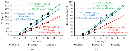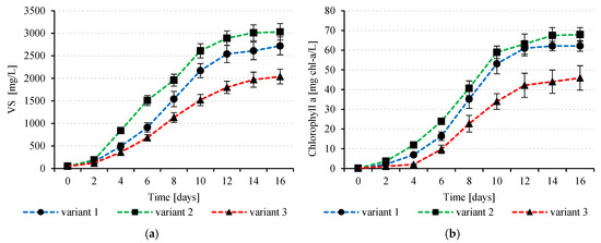 Changes in the biomass concentration of T. subcordiformis, expressed as VS (a) and Chl-a concentration (b), during cultivation as a function of the experimental variant.