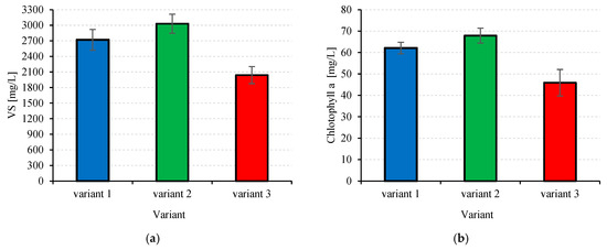 Final concentration of VS (a) and chl-a (b) in the biomass of T. subcordiformis as a function of the experimental cultivation variant used.