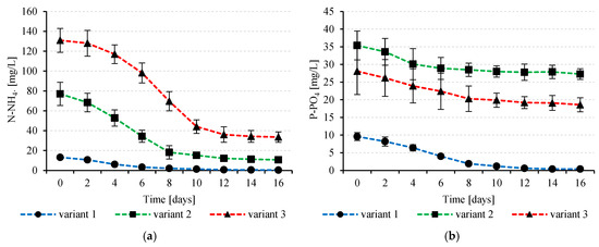 Microalgae require accessible, easily assimilable basic nutrients and trace elements for their dynamic development. The most important of these are nitrogen and phosphorus, which significantly limit the efficiency of biomass production systems [44]. The highest efficiency of nutrients consumption by the growing biomass of T. subcordiformis was observed in V1, where 97.6 ± 1.1% of N-NH4 removal (Figure 6a) and 95.8 ± 2.1% of P-PO4 removal (Figure 6b) were recorded. This high bioassimilation efficiency is due to the low initial concentrations of these fertilisers (Table 1). During cultivation, the N-NH4 concentration decreased from 13.2 ± 1.3 mg/L to 0.32 ± 0.1 mg/L (Figure 7a) and the P-PO4 concentration from 9.6 ± 1.1 mg/L to 0.40 ± 0.2 mg/L (Figure 7b). This is confirmed by the authors’ earlier studies [37]. The highest N and P removal efficiency, 99.3 ± 0.2% and 99.1 ± 1.3%, respectively, was observed in the variant in which the biomass cultivation medium was T. subcordiformis pure culture medium. In the system to which 25% of the dairy industry sewage was fed, N and P removal efficiencies of 98.1 ± 1.9% and 97.1 ± 1.4%, respectively, were observed. Increasing the proportion of fermented wastewater directly reduced the removal efficiency of biogenic compounds [37].