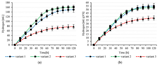 The course of total (a) and individual (b) biohydrogen production of T. subcordiformis biomass as a function of the experimental variant.