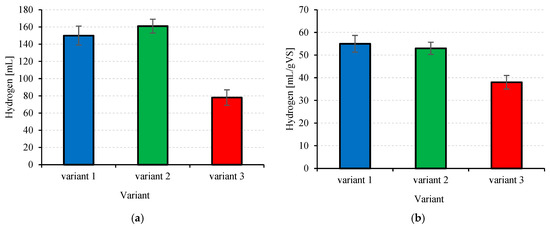 In V3, where the culture medium was MFC-E, a significantly lower efficiency of H2 production by the biomass of T. subcordiformis was observed (Table 2). It was found that, in this case, this was primarily determined by the initial lower concentration of microalgae in the respirometer compared to V1 and V2 (Figure 4a,b). The total H2 yield in this part of the experiments was 78 ± 9 mL (Figure 8a), resulting in a unit production of 38.0 ± 9 mL/gVS (Figure 8b). The H2 biosynthesis rates were 2.26 ± 0.11 mL/h and 1.06 ± 0.05 mL/gVS·h, respectively (Table 2). The H2 content in the qualitative composition of the biogas produced was 58.9 ± 1.1% and was comparable (p > 0.05) to the other experimental variants (Table 2). In other studies [34], a medium was used based on distilled water and chemical reagents, with between 25% and 100% of dairy industry effluents in the culture medium. The use of pure chemical reagents as a medium allowed the recovery of 119 ± 12 mLH2 at an average production rate of 3.01 ± 0.12 mL/h. The H2 content of the biogas was 52.7 ± 2.4%. The highest effects were achieved in the series with 50% wastewater content. The amount of H2 was 127 ± 7 mL, which resulted from the concentration of this gas of 62.7 ± 1.7% and the production rate of 3.94 ± 0.13 mL/h. A significant decrease in the efficiency of H2 production by the biomass of T. subcordiformis was observed when the proportion of wastewater in the medium was 75% and 100%. The production efficiency of this biogas component was 92 ± 11 mL (42.9 ± 2.3%) and 81 ± 6 mL (40.8 ± 3.1%), respectively [34].