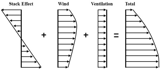 Equation (2) shows that airflow in buildings is determined by indoor–outdoor pressure difference, which is induced by external airflow, indoor–outdoor temperature differences, and HVAC system operation [20].
