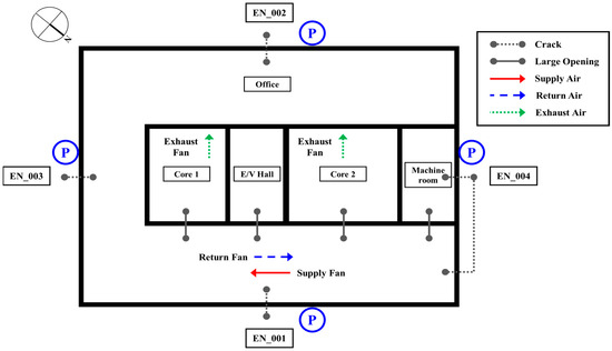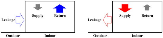 Airtightness refers to the degree to which the building envelope resists airflow due to pressure differences [7]. Buildings with poor airtightness experience heat loss due to infiltration, consuming more energy to maintain indoor temperatures [8]. Generally, buildings with high airtightness can prevent unintended airflow, introducing only the required amount of outdoor air for proper ventilation, resulting in less heat loss and lower energy consumption compared to buildings with poor airtightness. Air enters through gaps in the building envelope, where the size and shape of the gaps are not uniform, preventing the development of turbulent airflow. Infiltration through the building envelope not only increases energy consumption but also causes issues in indoor thermal comfort, air quality, moisture diffusion leading to condensation, difficulty in door operation, and noise due to indoor airflow, causing overall operational problems in buildings. To mitigate infiltration, strategies to improve building airtightness are actively discussed [9]. Strategies to enhance airtightness are broadly categorized into architectural and mechanical approaches. Architectural strategies include strengthening the airtightness of the building envelope, adding partitions in spaces where pressure differences occur, installing revolving doors, and setting up airlock vestibules. These strategies need to be considered from the design and construction stages, as they involve measuring and reinforcing the airtightness of the building envelope and doors, making them difficult to apply to already operational buildings. Therefore, mechanical strategies like maintaining positive indoor pressure through HVAC systems should be considered to reduce infiltration impacts. The American Society of Heating, Refrigerating and Air-Conditioning Engineers (ASHRAE) suggests maintaining buildings at a positive pressure (1–20 Pa) through HVAC systems to reduce infiltration. The pressure difference in buildings is influenced by outdoor airflow, indoor–outdoor temperature differences, and HVAC system operation, with the amount of airflow proportional to the pressure difference.