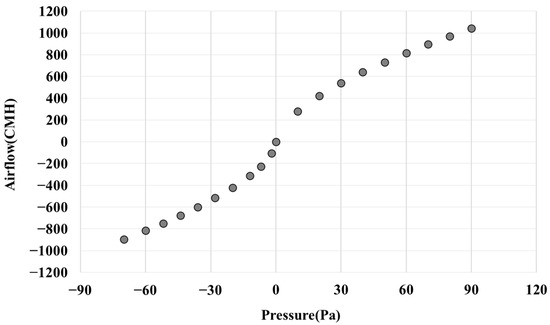 Airtightness is an inherent building characteristic representing the relationship between airflow through the building envelope and pressure difference, expressed by the power law equation in Equation (2) [18]. Infiltration amount due to pressure difference is determined by the leakage coefficient () and leakage exponent (n), which are fixed characteristics of the envelope, independent of outdoor conditions. The leakage exponent indicates the type of airflow through gaps, close to 1 for laminar flow and 0.5 for turbulent flow. The leakage exponent for typical concrete buildings ranges from 0.6 to 0.7 [19]. Assuming a leakage coefficient () of 70 and a leakage exponent (n) of 0.6, the relationship between pressure difference and airflow is illustrated in Figure 3. When the indoor–outdoor pressure difference (ΔP) is 50 Pa, the infiltration amount is 732 CMH. Dividing this by the building volume gives the air changes per hour at 50 Pa pressure difference, known as ACH50, representing building airtightness.