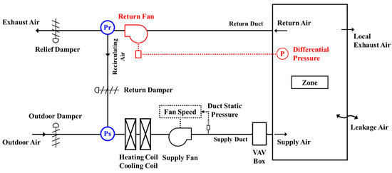 Schematic diagram of HVAC system with return fan for building pressure control.