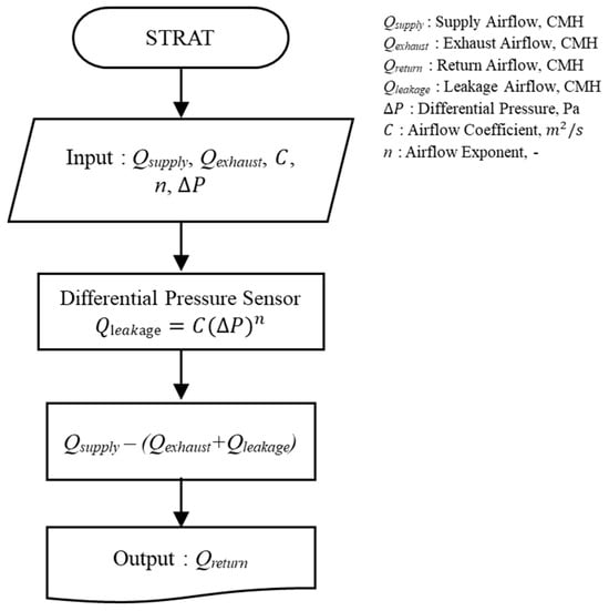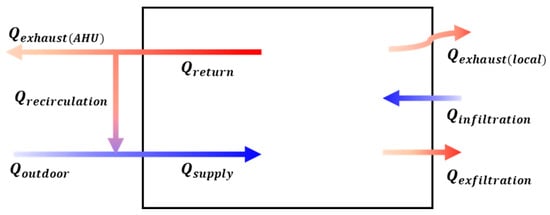 Building pressure differences can be maintained at positive pressure by adjusting HVAC system airflow, but general HVAC system operation does not consider pressure differences, leading to indoor air imbalance [21]. If indoor air imbalance persists, building pressure differences occur, causing increased indoor loads due to airflow through gaps and wasting heating and cooling energy to maintain indoor set temperatures [22]. Figure 5 illustrates ASHRAE’s building pressure model concept, showing potential airflow paths in buildings. According to the law of mass conservation, the sum of air inflow and outflow in a building is equal, expressed in Equation (3). This study proposes an HVAC system operation strategy to maintain appropriate positive indoor pressure by adjusting HVAC system airflow (Qsupply and Qreturn) to respond to continuously changing pressure differences induced by external airflow and indoor–outdoor temperature differences.