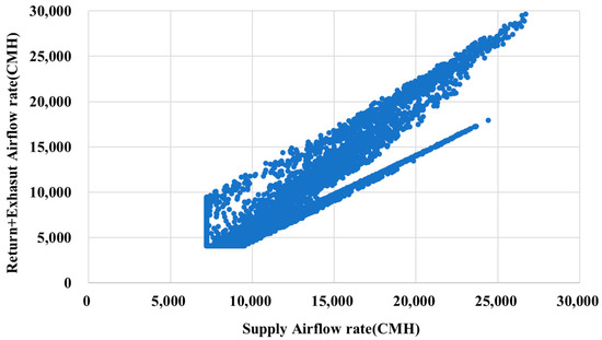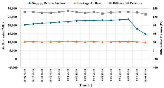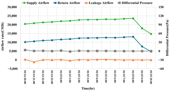 Simulation results obtained using the proposed return fan operation strategy in winter are shown in Figure 11. The return airflow of the HVAC system differs by 10,000–10,400 CMH from the supply airflow considering pressure differences, with a maximum pressure difference of 4 Pa and infiltration amounts of 0–280 CMH. The decrease in return airflow due to pressure differences reduced the pressure differences and infiltration amounts.