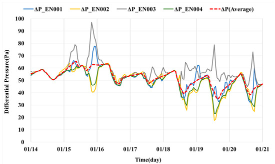 The proposed return fan operation strategy adjusts return fan airflow in response to real-time pressure differences. Implementing the proposed HVAC system operation strategy requires differential pressure sensors to monitor indoor–outdoor pressure differences. Differential pressure sensors should be installed in locations with minimal impact from rapid pressure changes, avoiding areas with significant airflow like doorways. Multiple sensors are used outdoors to offset wind pressure effects, using average values [24]. Building pressure differences are monitored on the four sides of the building envelope facing the exterior. Figure 9 shows indoor–outdoor pressure differences for each envelope side in winter, indicating varying pressure differences for each side. An HVAC system cannot address varying pressure differences for each side, so a reference pressure difference needs to be selected when applying the return fan operation strategy considering pressure differences. The average value of the pressure differences on the four sides maintains a consistent value, with less impact from momentary increases due to external airflow.