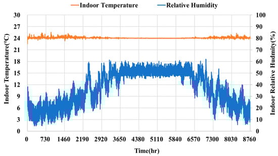 Figure 12 depicts the indoor thermal environment of Case 2. The annual indoor temperature ranges from 23.3 to 25.5°C, meeting the set indoor temperature target of 24°C ± 1°C, similarly to the traditional HVAC system operation method, and the humidity remains within 60%.