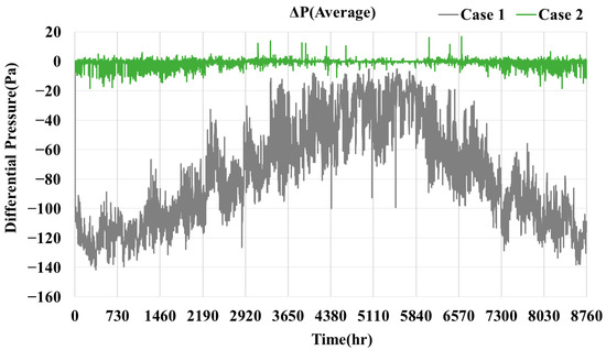 Figure 14 presents the average indoor–outdoor pressure differential for Case 1 and Case 2. The indoor–outdoor pressure differential for Case 1 ranges from −142 Pa to −5 Pa, while for Case 2, it ranges from −18 Pa to 17 Pa, showing a significant difference between the two control methods.