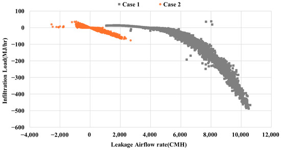 Figure 15 illustrates the airflow between the exterior walls and the interior, as well as the load caused by the airflow for Case 1 and Case 2. In this case, infiltration represents the total sum of the airflow occurring on all four sides of the building in contact with the outdoor air. For Case 1, the infiltration amount is proportional to the indoor–outdoor pressure differential, with a maximum infiltration amount of 10,593 CMH, a minimum of 1072 CMH, and an average of 6744 CMH. This indicates an average ventilation rate of 1.28 ACH (air changes per hour) due to the building envelope infiltration. For Case 2, the maximum infiltration amount is 2682 CMH, the minimum is −2557 CMH (exfiltration), and the average is 113 CMH, indicating an average ventilation rate of 0.22 ACH due to the building envelope infiltration. The average ventilation rate due to external infiltration decreased by 82.8%, from 1.28 ACH to 0.22 ACH. On the y-axis, negative values indicate heating loads due to infiltration, and positive values indicate cooling loads due to infiltration. For Case 1, the maximum heating load due to infiltration is 487.45 MJ/h, with an average of 128.26 MJ/h. For Case 2, the maximum heating load due to infiltration is 75.87 MJ/h, and the average load is −3.00 MJ/h, a reduction of approximately 98% compared to Case 1. The traditional HVAC system operation method (Case 1) resulted in significant heating energy consumption due to winter infiltration. However, the proposed method (Case 2) reduced the return airflow considering the infiltration amount due to the pressure differential, thereby reducing the infiltration amount and the load due to infiltration.