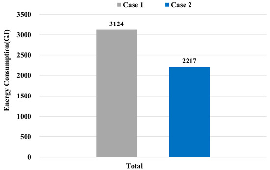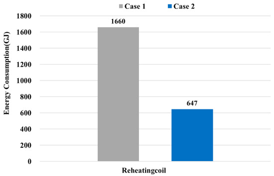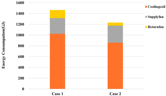 Figure 18 shows the annual total HVAC system energy consumption, including AHU system energy and reheat coil energy. Case 1’s energy consumption was 3124 GJ, while Case 2’s was 2217 GJ, a reduction of 29% compared to Case 1. This demonstrates the effectiveness of the proposed operation method in reducing energy consumption.